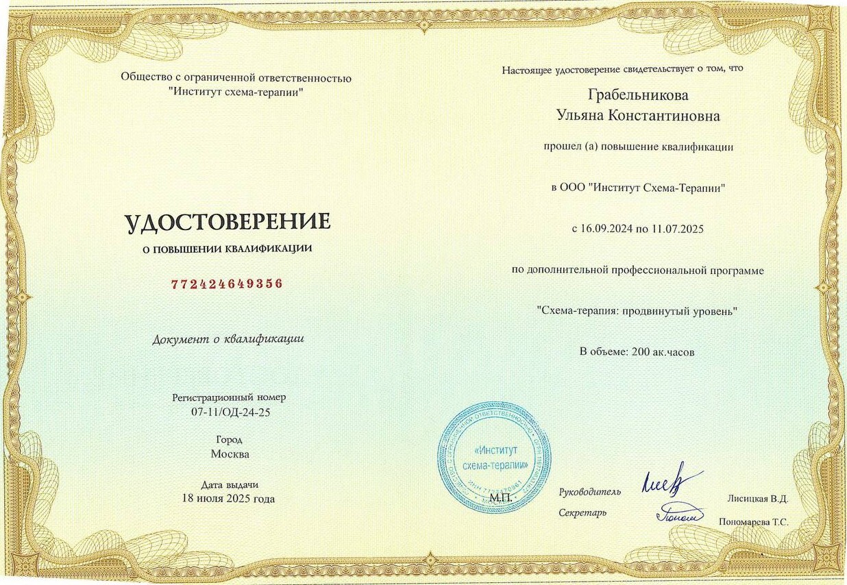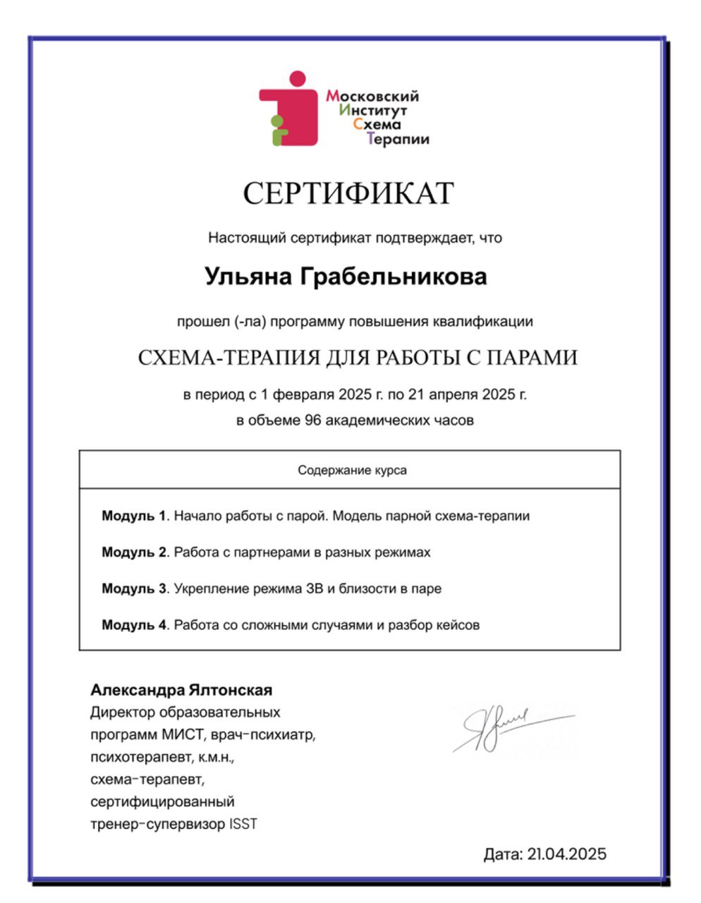Это хорошо структурированный, высокоэффективный и динамично развивающийся метод психотерапии. Схема — это модель поведения, которая формируется в детстве и укрепляются в течение жизни. Существует 18 негативных схем, которые “мешают” человеку чувствовать себя счастливым. Схема формируется, когда не удовлетворяются эмоциональные потребности. Есть потребности в любви и сострадании, безопасности и защиты и пр. Схема-терапия помогает “переписать” детский опыт и изменить поведение, чтобы не попадать в ловушку негативных схем. Отличительная черта схема-терапии, что она помогает разрешить проблему на трех уровнях: когнитивном, поведенческом и эмоциональном (экспериенциальном), что делает ее высоко эффективной даже в самых непростых случаях.