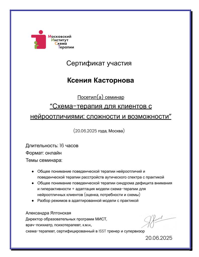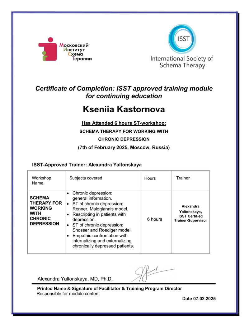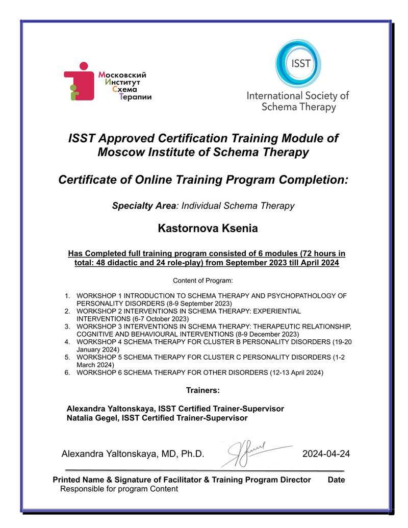 Это хорошо структурированный, высокоэффективный и динамично развивающийся метод психотерапии. Схема — это модель поведения, которая формируется в детстве и укрепляются в течение жизни. Существует 18 негативных схем, которые “мешают” человеку чувствовать себя счастливым. Схема формируется, когда не удовлетворяются эмоциональные потребности. Есть потребности в любви и сострадании, безопасности и защиты и пр. Схема-терапия помогает “переписать” детский опыт и изменить поведение, чтобы не попадать в ловушку негативных схем. Отличительная черта схема-терапии, что она помогает разрешить проблему на трех уровнях: когнитивном, поведенческом и эмоциональном (экспериенциальном), что делает ее высоко эффективной даже в самых непростых случаях.