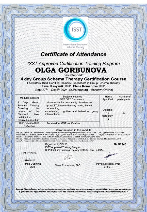 Это хорошо структурированный, высокоэффективный и динамично развивающийся метод психотерапии. Схема — это модель поведения, которая формируется в детстве и укрепляются в течение жизни. Существует 18 негативных схем, которые “мешают” человеку чувствовать себя счастливым. Схема формируется, когда не удовлетворяются эмоциональные потребности. Есть потребности в любви и сострадании, безопасности и защиты и пр. Схема-терапия помогает “переписать” детский опыт и изменить поведение, чтобы не попадать в ловушку негативных схем. Отличительная черта схема-терапии, что она помогает разрешить проблему на трех уровнях: когнитивном, поведенческом и эмоциональном (экспериенциальном), что делает ее высоко эффективной даже в самых непростых случаях.