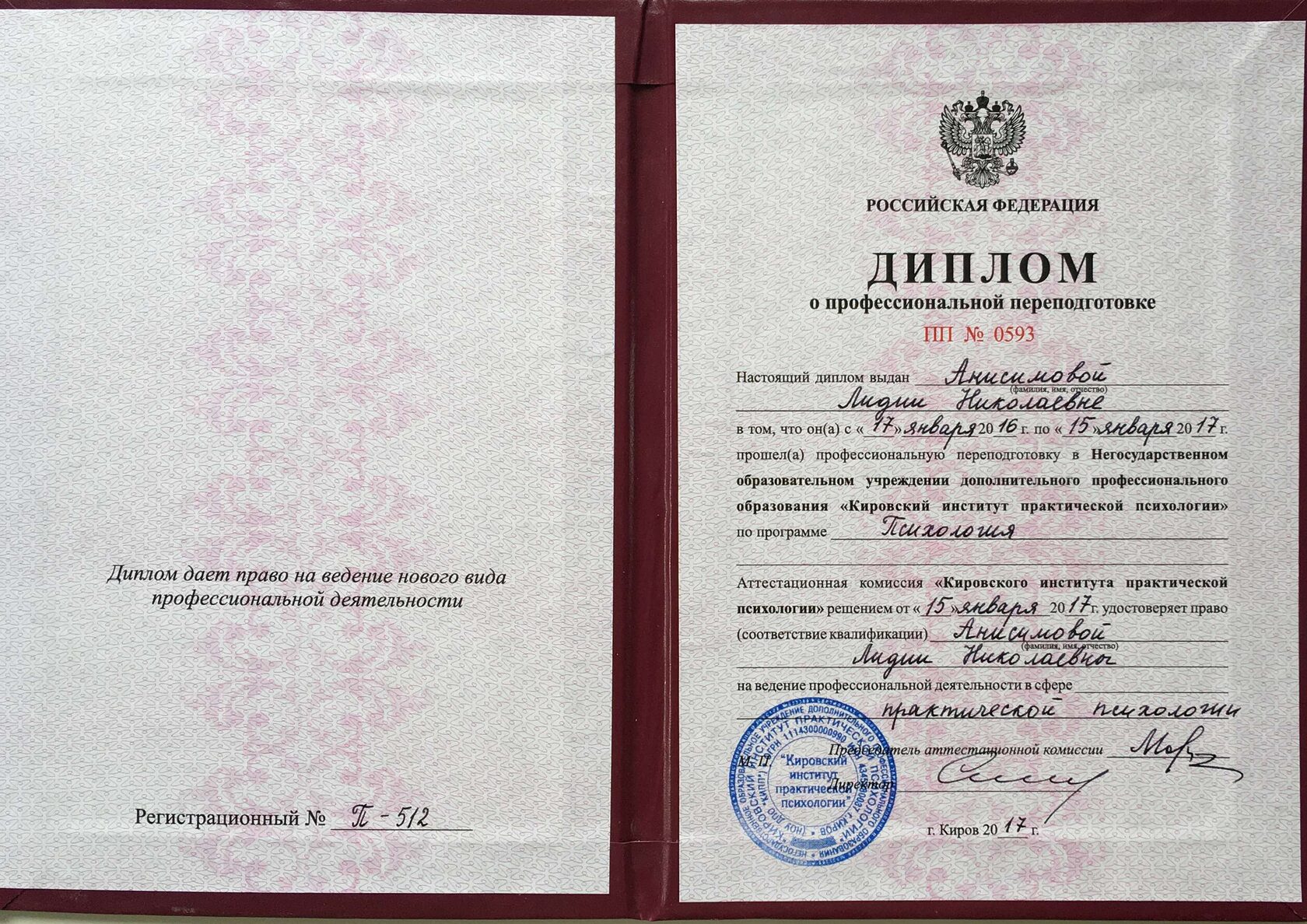 •2016-2017 гг. НОУДПО «Кировский институт практической психологии». Специальность: Психолог.