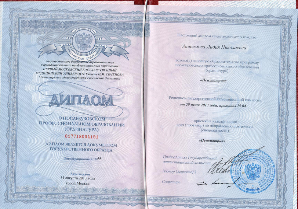 •2010-2013 гг. ПМГМУ им. И.М.Сеченова. Кафедра психиатрии и психосоматики ФППОВ Интернатура, Ординатура. Специальность: Психиатр.
