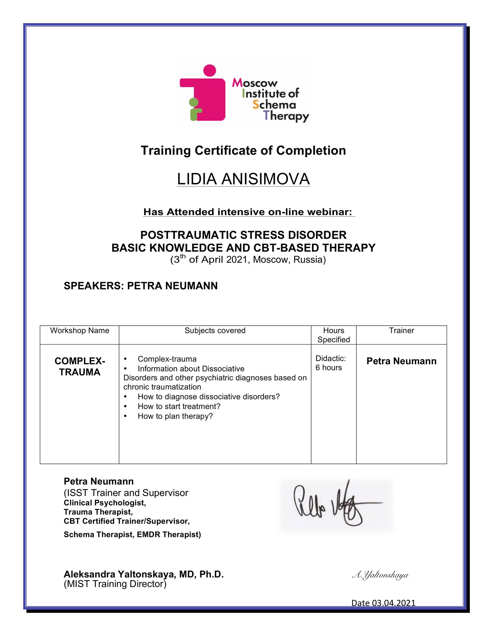 - 2021 г. CBT-based therapy for Posttraumatic stress disorder, complex-trauma, dissociative disorder, 2021, Petra Neumann, МИСТ