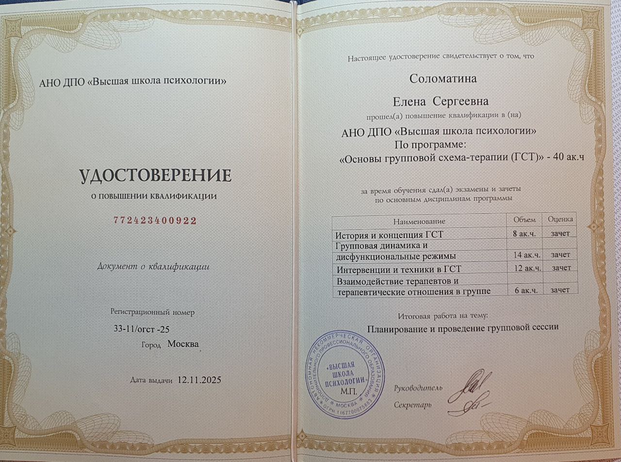 • 2022 – Трудности в построении близких отношений, Московский институт схема-терапии