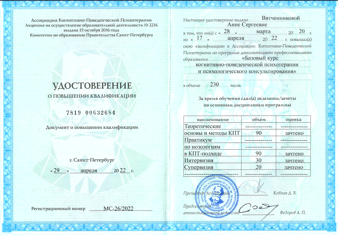• 2022 г, Базовый курс когнитивно-поведенческой психотерапии и психологического консультирования, АКПП