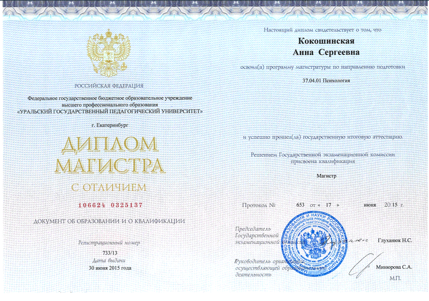 • 2015 «Уральский государственный педагогический университет», диплом с отличием, магистратура. Специальность: Психология.